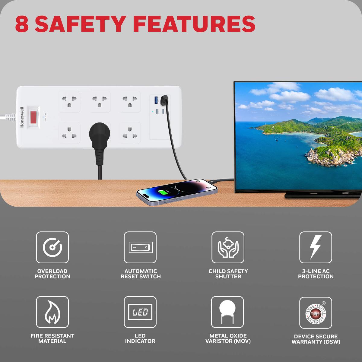 • 8 คุณสมบัติความปลอดภัยขั้นสูง ด้วย ระบบการป้องกันไฟเกิน, ระบบสวิตช์ควบคุมรีเซ็ตอัตโนมัติ, ระบบชัตเตอร์นิรภัยสำหรับป้องกันความปลอดภัยของเด็ก, วัสดุทนทานต่อความร้อน และไฟได้เป็นอย่างดี, ระบบไฟแสดงสถานะ LED สำหรับการป้องกันไฟกระชาก, ระบบการป้องกันไฟฟ้ากระแสสลับแบบ 3 สาย, ระบบ MOV ช่วยป้องกัน และควบคุมไฟฟ้า, การรับประกันความปลอดภัย DSW ด้วยวงเงินสูงสุด 12,500 เหรียญสหรัฐ