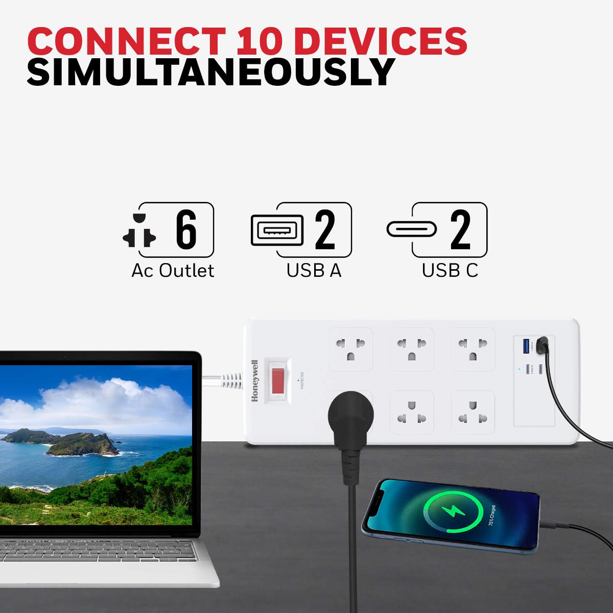 Honeywell 6 Outlet Surge Protector with 2 Type C & 2 USB HC000048/SRG/1.8M/WHT/6/2U/PD25W/TH