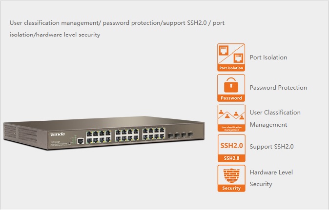- Support command line interface (CLI), Telnet, the configurations of the Console port